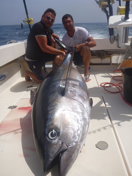 As indicated above, the Big Eye Tuna who has been caught today had a weight of 145 kilos/320 lb, so an absolutely New Boat Record.