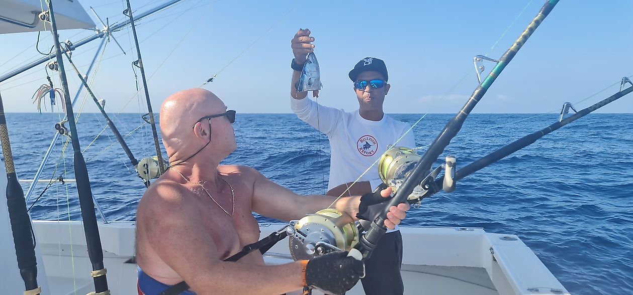 Pêche à la traîne, avec une bonite de l`Atlantique précédemment capturée, malheureusement un beau gros Wahoo a été manqué.