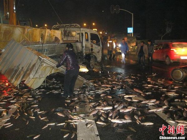 Een vrachtwagen vol met vis raakte betrokken bij een ongeluk in Yichang, provincie Hubei, waarbij het met vis gevulde voertuig over de kop sloeg.