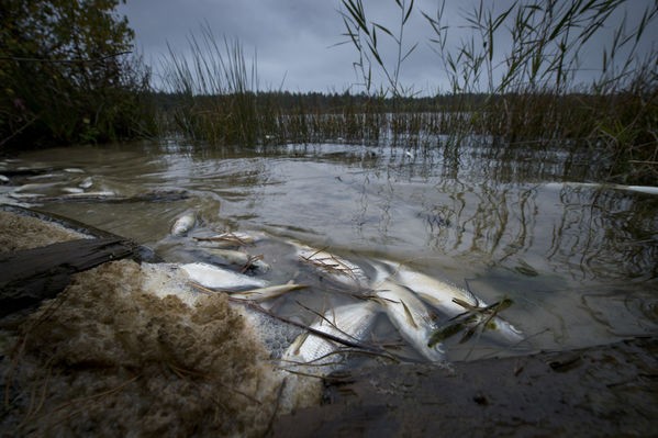 Boswachter Evert Thomas namens de drie partijen: "We hebben een heel sterk vermoeden dat de tarra die we mede gebruiken om de plas te dempen de oorzaak is. Het leemrijke zand, dat we hier ook voor gebruiken, kan niet de oorzaak van de vissterfte zijn. Met dat zand is er nooit een probleem geweest. Het moet de tarra wel zijn.”