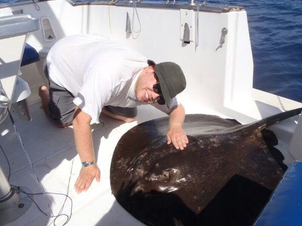 Den holländska sportfiskaren Onno van Veen och hans vän Guus Meeuwis hade charter i morse tillsammans med sina två söner, båten Cavalier. Efter deras framgångsrika bottenfiskeresa förra måndagen beslutades att prova trollfisket idag. Du vet aldrig? Syndar, utanför att se bara en sköldpadda och en skola av delfiner hade vi en lugn dag. Tack igen och förhoppningsvis ses vi igen nästa år. Också på Blue Marlin 3 trollade besättningen med sina klienter under de första tre timmarna av resan, men också här utan framgång. I andra delen av resan, av Anders Lindholm från Sverige, fångades en ganska stor Roughtail Stingray uppskattad till 80 kilo. Hans