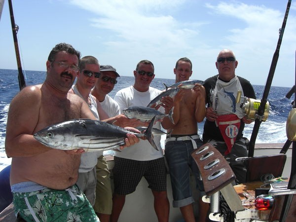 CAVALIER RELEASED BLUE MARLIN Billfish-säsongen på Gran Canaria pågår fortfarande. Nymåne eller fullmåne, det spelar ingen roll i år. Marlinen matar nästan varje dag. Så även idag ombord på Cavalier. Den lyckligaste fiskaren i morse var herr Bicherothe, som anslöt sig till en blå marlin. Striden tog cirka 25 minuter och vikten av marlinen uppskattades av besättningen till 180 kilo. Marlinen släpps. Grattis till sportfiskare och besättning igen. Här förutom på bilden visar vissa kunder sina skipjack-tonfiskar. Holländaren Hans