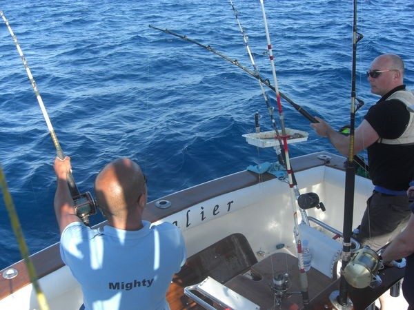 REEFFISKNING "Fishermen Verhulst" från Holland fiskade idag på Blue Marlin 3 sin sista resa i en serie om sex. Två av dessa sex fisketurer har de trollat, men tyvärr utan fisk. De andra fyra resorna var mycket mer framgångsrika med fångster från olika arter av Rays, Tope och Red Snappers. Mike van Onselen, också från Holland, fiskade de senaste 4 dagarna med 5 vänner på båten Cavalier. Dessa fiskare fångade inte heller någon fisk på sina trollturer. På revet fångade de en bra storlek Barracuda och några mycket bra storlek Stingrays. Tack igen för båda grupper av vänner, för en härlig fiskevecka, på Blue Marlin 3 och på Cavalier. Holländaren Hans