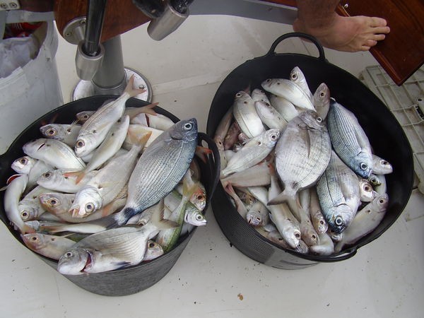 SEABREAMS Denna molniga lördag fiskade Cavalier i morse på ett av deras favoritrev. På ett djup mellan 25 och 31 meter fångade klienterna många (216 bitar) olika arter av havsströmmar. Tyvärr fångades inga stora. Tack till Armando, Victor och Tota från Spanien och Henning från Danmark. Med ljusstavar hade de ett hårt jobb idag. Vädret är inte riktigt som det borde vara och väderprognosen förutspådde återigen regn och en blåsig söndag. Förhoppningsvis har de fel den här gången! Hans