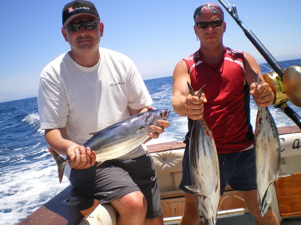 SKIPJACKS Efter "Spearfish Explosion" från igår lämnade CAVALIER i morse hamnen med bara optimistiska fiskare. De hade en bra start direkt med att hitta en skola med Skipjack-tonfiskar i bra storlek. De lyckliga sportfiskarna att fånga några av dessa Skipjacks var Peter Anderstedt och Max Blant, båda från Sverige. Sedan var det igen ganska lugnt. Klockan 14 såg vi den enda Spearfish på denna resa, men hon var inte intresserad av vår betfisk. Det är fiske folk! Inte varje dag kan vara en 'topp` dag. Hans