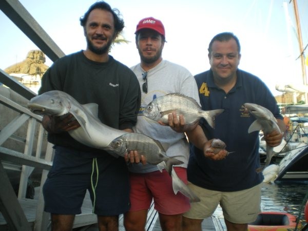 STOR FISKE De sista dagarna var vädret på Gran Canaria mycket dåligt. Vi hade mycket regn och det var väldigt blåsigt. Sedan två dagar fiskar bara vår Cavalier-båt igen. Vissa spanska kunder var här mycket framgångsrika med fångsten av Seabreams och tunga strålar. Veikko Björn från Finland fångade en enorm Tope på Cavalier. Hans