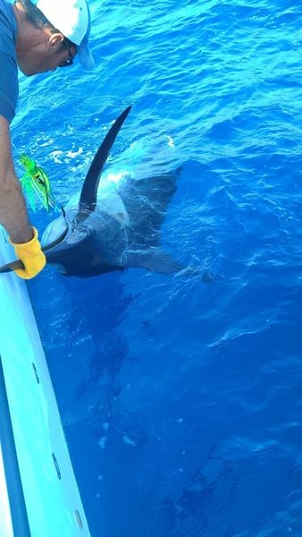 Söndag, måndag och även idag. Båten Cavalier fångade i morse sin 3: e Blue Marlin på tre dagar. Det var återigen den holländska sportfiskaren Johan som släppte uppskattningsvis 280 kg Blue Marlin. Det fanns också en trevlig Dorado på denna resa. Hans Canaria fiske nyheter